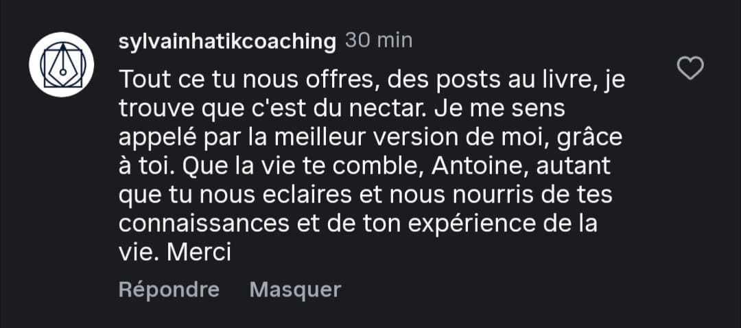 "DEPUIS QUE J’AI TRAVAILLÉ AVEC ANTOINE, J’AI ÉLEVÉ MES STANDARDS RELATIONNEL DANS MON ENTREPRISE ET DANS MON PERSO. J'AI RETROUVÉ UNE SÉRÉNITÉ EN APPLIQUANT SES OUTILS. SON ACCOMPAGNEMENT EST IMPACTANT ET IL SE SOUCIE VRAIMENT DE TON ÉPANOUISSEMENT. SI TU VEUX PLUS TON ÉNERGIE, TON TEMPS POUR CONSTRUIRE TON ENTREPRISE ET BÂTIR DES RELATIONS SAINES, LIS CE LIVRE."